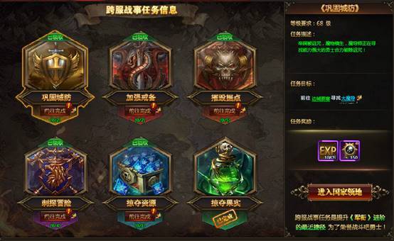 a)玩家等级≥68级开启国家任务,国家任务共有6种,每种任务的等级要求有所不同;