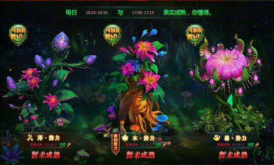 每天固定时间国家的果实将会成熟,采摘不同的果树可获取进阶石、龙女升级石、绑定钻石等道具。去其他势力国家果园进行采摘时,小心别被其他玩家击杀噢!