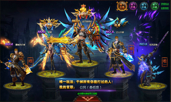 a)本服玩法,1V1自动战斗,击败官职胜任者,可夺得职位和职位称号,同时拥有职位特权和福利,职位称号和普通称号可以同时佩戴