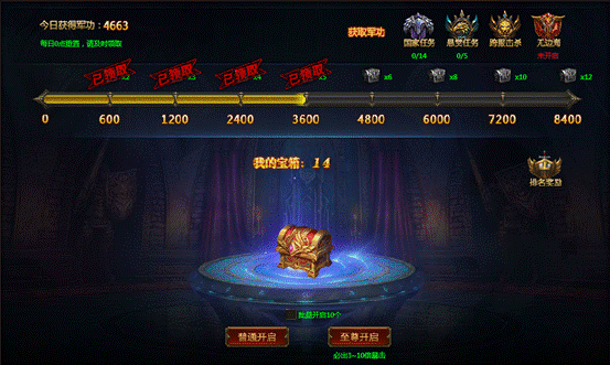 每天完成国家任务、悬赏任务、跨服击杀获得军功值后,玩家还可以在每日军功界面领取相应目标奖励: