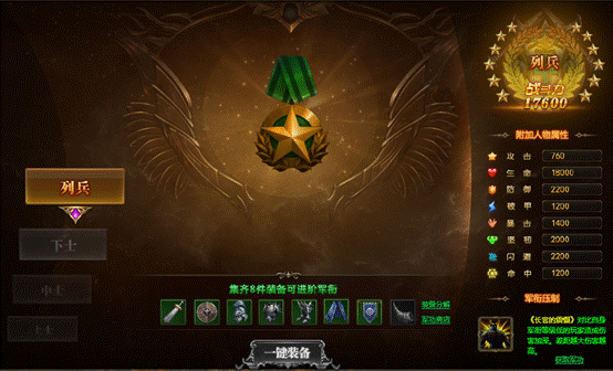 b)集齐8件同等级的军衔装备可进阶军衔,并激活护卫之盾单体技能,使用该技能将在一定时间内减少一定程度的伤害,让你pk对战更持久!