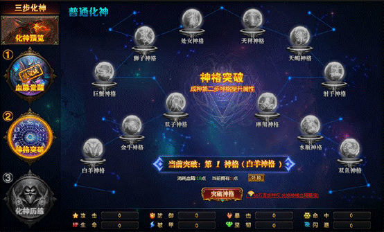 ②神格突破: 血脉觉醒后,通过兑换血精进行神格提升,不同的神格会有不同的属性加成,让你的战力高人一等;