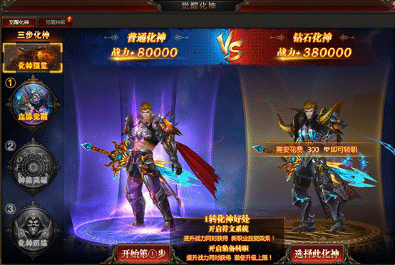1. 觉醒化神有两种:一种为普通化神,普通化神完成后玩家能涨80000战力;另一种为钻石化神,成功后能涨380000战力;