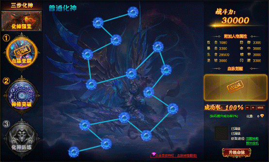 ③化神历练:完成神格突破后,可参与化神历练,击杀化神副本中BOSS,即能成功化神!