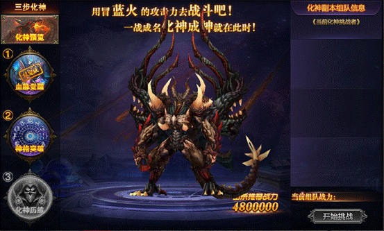 ③化神历练:完成神格突破后,可参与化神历练,击杀化神副本中BOSS,即能成功化神!